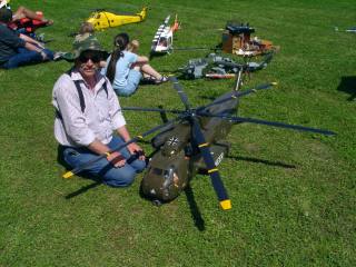 He specialized on building model helicopters and rotor blades; here with his favourite model, a CH-53, built from scratch.